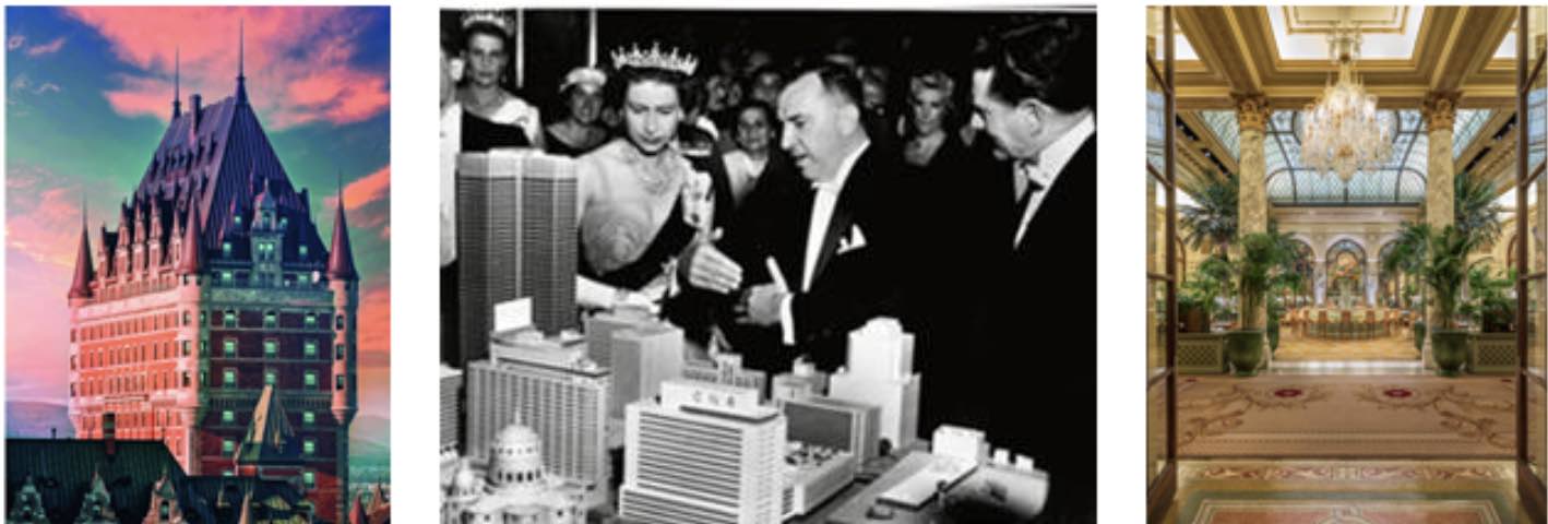 (Fairmont Le Château Frontenac ; la reine Elisabeth II à Montréal, vers 1959 ; la Cour des palmiers du Plaza, un hôtel géré par Fairmont)