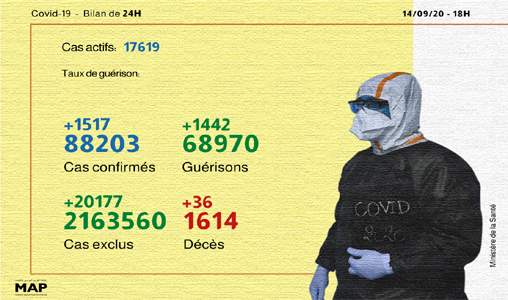Mille cinq cent dix sept (1.517) nouveaux cas d’infection au coronavirus (Covid-19) et 1.442 guérisons ont été enregistrés au Maroc au cours des dernières 24 heures, a annoncé lundi le ministère de la Santé.